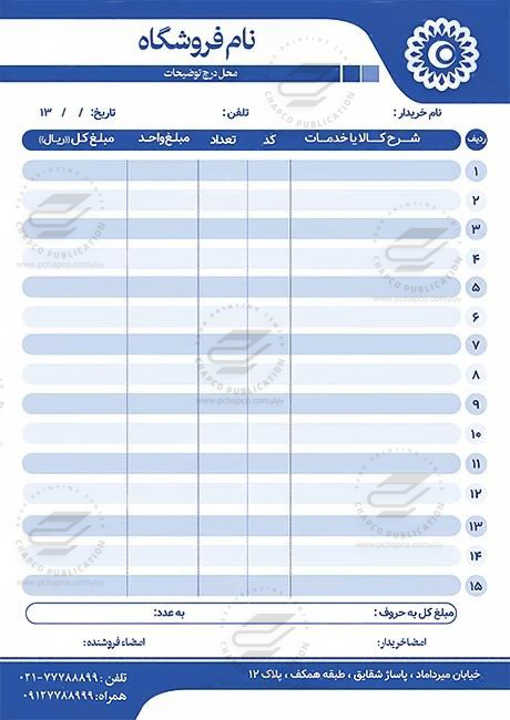 یکی از مزایای برجسته این طرح، قابلیت شخصیسازی کامل آن است. لوگو، نام کسبوکار و شماره تماس شما به جای placeholders پیشفرض جایگزین میشود و فاکتور به صورت اختصاصی چاپ میگردد. این ویژگی، فاکتور را منحصر به برند شما میکند و امکان درج مهر یا رنگبندی اختصاصی را فراهم میآورد. سفارش چاپ فاکتور با طراحی اختصاصی، همراه با قابلیت درج لوگو و مهر، تجربهای منحصربهفرد برای مشتریان چاپکو است.
